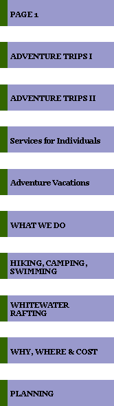 Guiding Principals Keep in mind that small and light are optimal. Less is more in the mountains, in that we tend to enjoy ourselves more when we carry less and simplify our needs. So aim for light and efficient. Mountain weather can change quickly. A sunny, hot day in summer can turn cool, windy and wet quickly. It's important to be prepared. That way you'll be comfortable and safe. Protect your personal items from water with plastic garbage or zip lock bags in a variety of sizes. Please do not bring cotton sweatshirts, jeans, etc. Cotton will not dry quickly and tends to make you cold. Cotton clothing is also heavy to carry when it soaks up water. Wool and synthetics (polypropylene or fleece) keep you warm even when wet - they dry quickly. The basic "bring list" A layered clothing system to keep you warm and dry: Waterproof and windproof jacket and pants - LARGE ENOUGH TO COVER YOUR WARM LAYERS UNDERNEATH in cold seasons! Gore Tex is best, but nylon will do the job. Mid-weight fleece top and pants. Light weight polypropylene top and bottom (long underwear). Wool or fleece ski hat. Light weight gloves or mittens. Wool is great. It keeps you warm even when wet, but it is bulky and heavy. Fleece is superior to wool. It keeps you warm when wet and dries quickly. The above items are your foundation in the high mountains, even in summer. They will keep you comfortable and safe. Remember that for these items in particular, it's better to have them and not need them, then to need them and not have them. For early Spring, late Fall and winter add: Heavy weight polypropylene top and bottom. Heavy weight fleece top. Heavy weight gloves or mittens. For winter trips: winter jacket. Light weight hiking boots or shoes. Be sure your boots are comfortable, fit and are broken in - at home!!! Waterproof them if necessary. A pair of sandals or sneakers for in camp comfort and low impact. Synthetic/wool socks (2-3 pairs). 2 pairs of hiking shorts, nylon recommended, cotton is ok, but remember they will not dry very well. A couple of shirts/tops A ball cap with a bill or other style hat is great for protection from sun and rain. A bandanna or two can be very handy. Sun-glasses and sun screen. Bug repellant. Toiletries: toothbrush and tooth paste (small size). comb/brush, biodegradable soap, small synthetic hand towel, waterless antibacterial hand soap/lotion and deodorant. Personal TP kit: A zip-lock bag with enough toilet paper for your trip. Any prescription or over the counter medication that you must have on hand. A "comfort kit" containing any over the counter medicine you need on hand or take regularly. A small, simple personal first aid kit. Solution for your contacts. Small, light, plastic AA battery head-lamp. A flash light is OK, but a head-lamp is best. Fresh batteries. Extra batteries. Camera (small disposable is best), journal, paperback book (small, lightweight). Two plastic 1 liter water bottles, with large mouth screw type lid. Small Swiss Army style knife. A couple of plastic garbage bags, and 1 gallon and quart size zip lock bags to organize and protect your things from water, etc. They are great for dirty clothes, too. Please do not bring radios. If you must bring your cell phone or pager, please respect your fellow hikers. Video cameras, binoculars, etc. can be fun, but remember that they add to your pack weight. Remember SMALL and LIGHT! We provide the following high quality equipment: Backpack, sleeping bag and Thermarest ground pad, tent, kitchen hardware and all group gear.